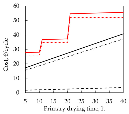 It should also be noted that this result comes from a depreciation time of the freeze-dryer of 20 years, which could be greater than the common depreciation time of normal laboratory equipment, and the CC values do not consider the maintenance that is always required when a machine works for so many years. Costs related to the maintenance are scarcely documented in the literature and, therefore, it is difficult, if not impossible, to perform an estimation in such direction. The maintenance costs in industries are said to range from 15% to 40% of the total production costs [22,23,24], while in some cases peaking to 70% [25]. It is clear that those numbers can change dramatically from case to case, and as a consequence of the specific strategy of each company, and, therefore, it would be pointless to include them in the calculation. However, this result confirms that the main cost of freeze-drying is due to the raw materials and to the investments related to the machine, and not the effective utilization of the apparatus. Under these circumstances, it is possible to assume that the only reason to make any optimization in the freeze-drying cycle to reduce its total length is that more cycles would be performed in the lifespan of the freeze-dryer and, therefore, the CC would be reduced alongside with an increase in the throughput. Moreover, if the freeze-dryer works only in a 5-day working week, the correlation between the total length of the cycle and the CC is not linear. The CC per cycle is reduced only if one more cycle could fit completely in a week, and this is something that should be carefully considered when trying to reduce the costs.