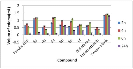 Figure 3 graphically shows the obtained results for the volume of acute inflammatory edema induced in the rat paw at different time intervals (2, 4, 6, 24 h) for the groups treated with the studied compounds (6a–f); for the groups treated with ferulic acid, diclofenac sodium, and indomethacin; and for control (treated with Tween 80). It is appreciated that the lower the volume of acute inflammatory edema, the higher the anti-inflammatory effect is.