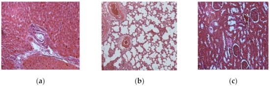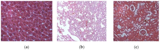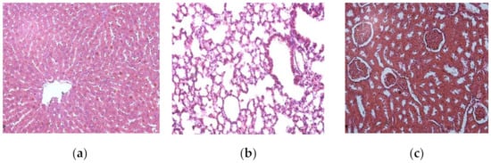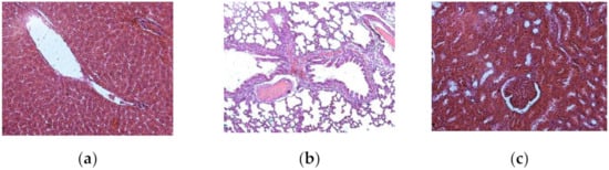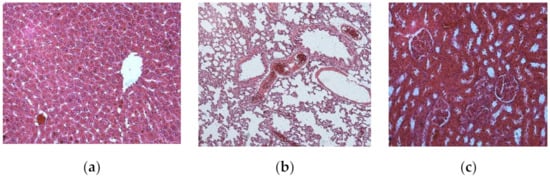 The examination of the control group of rats, for which no substance was administered, showed a normal morphology of the investigated organs, liver, lung, and kidney, respectively (Figure 4). The three organs were chosen for their particular sensitivity when substances in the category of those tested in this study are used.