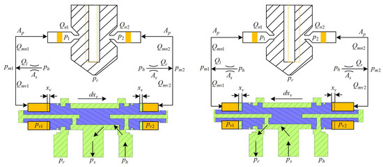 The spool moves under the combined action of the pressure difference in the control chamber, the pressure difference in the feedback chamber, and the return spring. With the deviation of the flapper, a control pressure difference will be generated in the control chamber on both sides of the spool. The feedback chamber is connected to the oil return chamber and the output chamber through the flow passage in the valve inner chamber. The dynamic equation of the spool is expressed as
