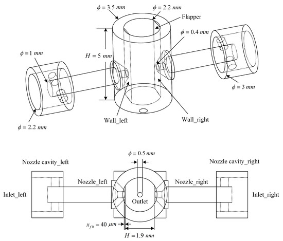 In view of the problem that the traditional servo valve modeling method cannot describe the servo valve system from the component level, the object-oriented Modelica modeling language is used to model the entire valve [5]. Considering the nonlinear terms that are often limited in establishing the description equations, Dasgupta and Murrenhoff [6] used a Bond diagram technique to establish a comprehensive dynamic model of the hydraulic motor drive system.Using the bond graph method has the advantage of dealing with complex systems with multiple energy domains. The servo valve can be modeled according to its electromechanical coupling characteristics [7]. Although researchers have added more nonlinear parts in the servo valve modeling process, it is still difficult to accurately express the parts with complex flow fields. The pilot stage is a key part of driving the movement of the spool, and the position of the flapper will directly affect the stability of the servo valve output. Hayashi [8] uses Navier–Stokes equations and continuity equations to describe the flow in the flat-faced nozzle-flapper valve. With the development of numerical simulation technology, scholars have continuously deepened the research on the flow force of the flapper. Mchenya [9] studied the flow field distribution in the pilot-stage of the servo valve and the relationship between the flow rate and the pressure drop across the nozzle. Under different inlet velocities and different geometric model sizes, Li [10] simulated the flow field distribution, vortex and pressure oscillation changes in the jet flow field. Subsequently, Li [11] conducted experimental observations within the range of Reynolds number from 630 to 2500, and compared it with the CFD simulation results to confirm the occurrence and location of the cavitation source.