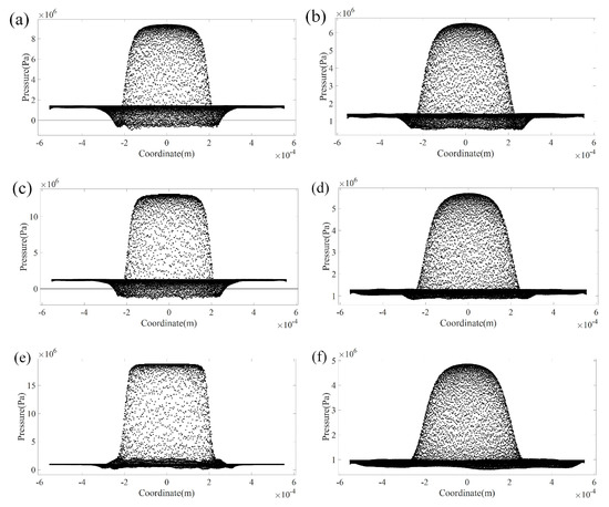 The pressure distribution on the left and right sides of the flapper surface with different offsets. (a) and (b) show the situation when the flapper deflects 15 m. (c) and (d) show the situation when the flapper deflects 25 m. (e) and (f) show the situation when the flapper deflects 35 m.