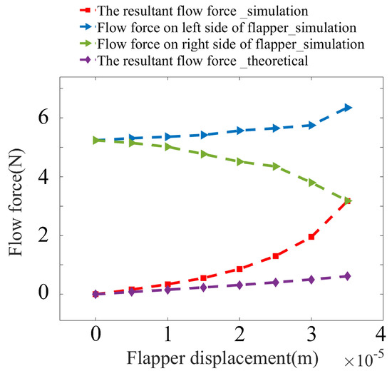 The function fitting of the flow force difference data can be obtained as the deviation of the flapper increases, and the curve of numerical simulation and theoretical calculation of flow forces on the two sides of the flapper is shown in Figure 9.