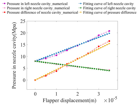 When the deviation of the flapper increases, the pressure difference data of the control cavity can be obtained for function fitting. Numerical simulation and fitting curve of pressure in nozzle cavities are shown in Figure 10.