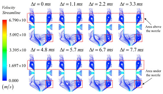 In order to observe the change of turbulence in the pilot stage, the longitudinal section at the center of the nozzle is selected. Figure 11 shows the turbulence distribution at the profile in a period. In the pilot stage shown in the figure, the flappers are all deflected to the left, and the radial clearance on the right is reduced. Since the pilot stage has a symmetrical structure at the zero position, it is only necessary to consider the situation where the flapper deflects to one side. There is a large-scale vortex on the both sides of the flapper in the area above the nozzle, and the vortex does not show a large change with time. In the area under the nozzle, there is only a large-scale vortex on the larger radial gap of the flapper, and the vortex exhibits regular contraction and expansion in one cycle.