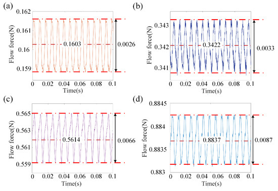 Numerical simulation results of transient flow force on flapper. (a), (b), (c) and (d) are the simulation analysis results of the transient flow force when the flapper deflects 5, 15, 25 and 35 m, respectively.