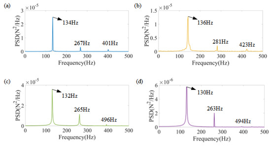 Frequency domain spectrum of transient flow force. (a), (b), (c) and (d) are the frequency domain spectrum of transient flow force when the flapper deflects 5, 15, 25 and 35 m, respectively.
