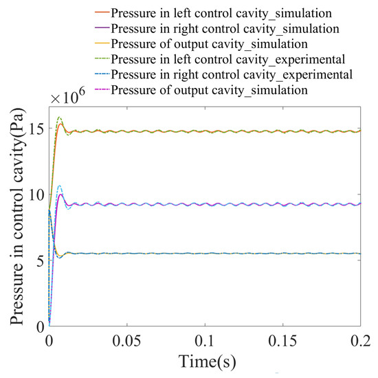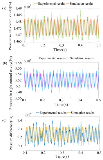 As shown in Figure 15, select the data for the pressure and pressure difference of the control cavity within the time of 0.1 to 0.5 s. The curve includes two parts: simulation and experimental collection, where (a), (b), and (c), respectively, show the experimental and simulation data of the pressure in the left control cavity, the pressure in the right control cavity, and the pressure difference between the two control cavities.