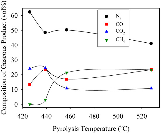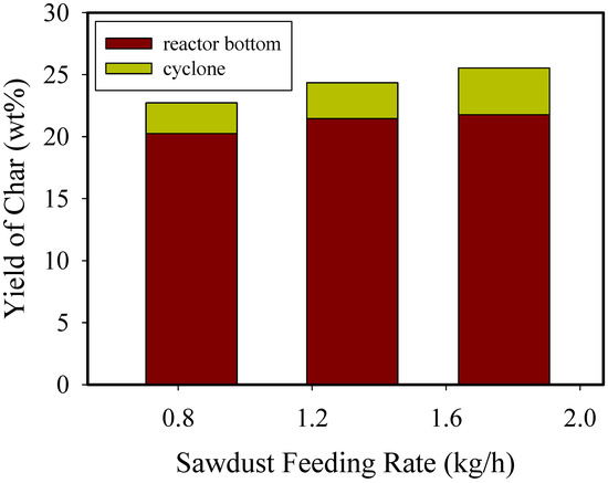 | Pyrolysis Temperature (°C) at 0.84 kg/h Feeding Rate | Sawdust Feeding Rate (kg/h) at 440 °C | |||||||