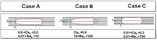- Finally, for low values of CaB, the bubble and liquid phase flow with similar velocity. This scenario involves the presence of semi-infinite recirculation regions (in MRF) ahead and behind the bubble. Additionally, decreasing the CaB leads to recirculation regions that occupy a higher cross-sectional area—Case C.