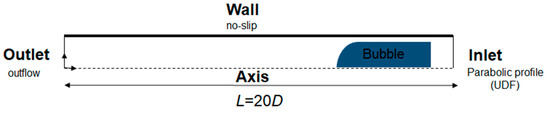 The first set of simulations were performed in ANSYS Fluent® 16.2. A 2D domain (assuming axisymmetry) was drawn representing half of a cylindrical domain with a length 20 times larger than the diameter (D = 100 μm)—Figure 2. A uniform mesh with 100 × 4000 elements was generated in this domain. Inside the domain, a bubble with an approximated shape (quarter of a circle connected to a rectangle) was added. The bubble base is set at 1.5 D from the Inlet and has a length of 3 D and a maximum width of 0.455 D.