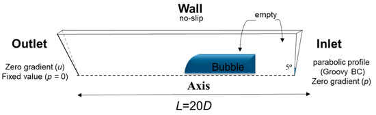 In terms of velocity at the boundaries: laminar parabolic velocity profile was imposed at the Inlet, a no-slip condition was set at the Wall, a symmetryPlane condition at the Axis, and a zeroGradient type was considered at the Outlet. For the pressure variable, a fixed zero value was imposed at the Outlet, while for the Wall and Inlet a condition of zeroGradient was considered. The solution was also initialized with only liquid phase (α = 1) present in the domain with the Inlet being defined with a fixed value of 1. The Outlet and Wall are defined as zeroGradient. The bubble (α = 0) was subsequently added using the setFields utility of OpenFOAM®. The bubble is defined with an approximated shape (a quarter of a circle for the nose linked to a rectangle for the bubble body) and with a velocity equivalent to the one predicted in previous work [18].