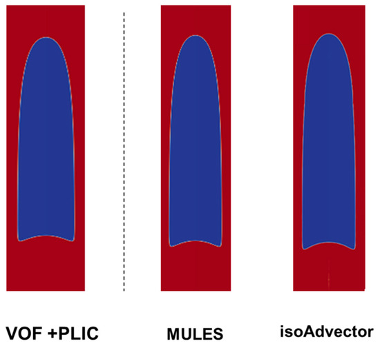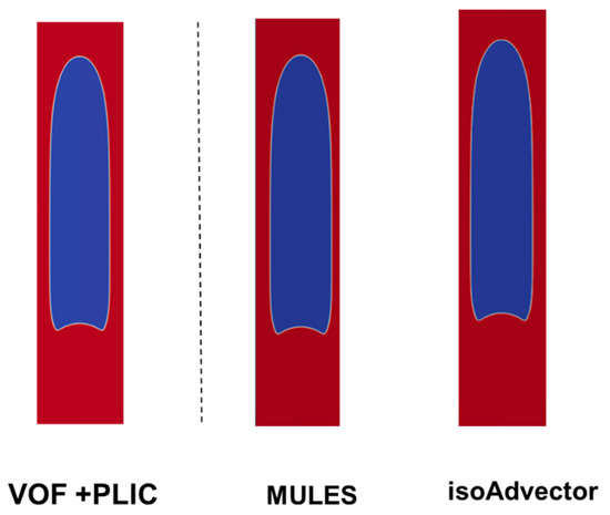Case B is characterized by the dimensionless numbers of ReB = 100 and CaB = 0.8. This case presents the characteristic shape of a Taylor bubble and, when compared with the previous case, the most obvious difference is in the tail shape—Figure 8. Once again, Figure 8 presents the contours of the phases acquired using ANSYS Fluent® and OpenFOAM®. It should also be pointed out that, for this case, there will be a closed recirculation area below the tail (assuming MRF).