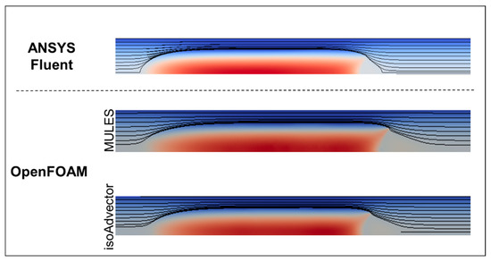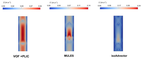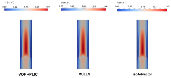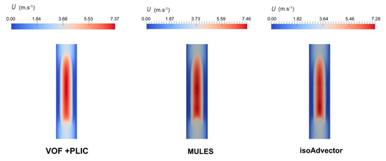 For both solvers in Open FOAM® (MULES and isoAdvector), the bubble velocity obtained was 3.5 m·s−1. With ANSYS Fluent®, a slightly higher velocity of 3.6 m·s−1 was predicted. Despite the slight differences, both methods seem to be able to predict fairly precise bubble velocity values.