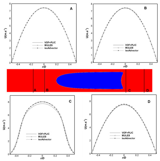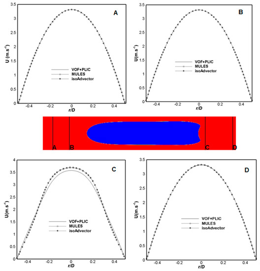 The profiles show that the velocity behavior above the bubble and at one diameter from the tail are fairly similar no matter the method used, i.e., the profiles overlap. However, as suggested by Figure 5, there is a difference (deviation of 3% at r/D = 0) in the velocity in the position closest to the tail (C), where the values acquired using VOF + PLIC (ANSYS Fluent®) are lower than the ones predicted using OpenFOAM®.