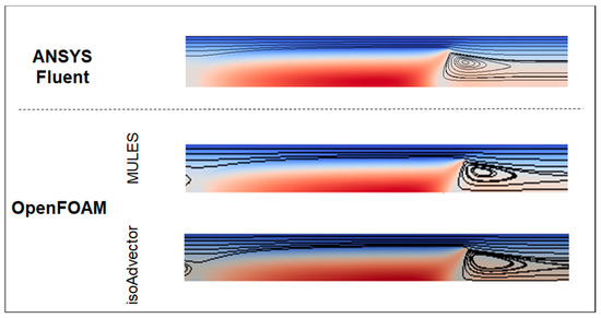 The velocity fields obtained with the different solvers are also compared (Figure 9). From this Figure, the contours do not reveal any significant difference.
