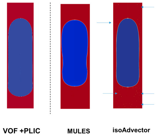 Figure 12 shows that the bubble acquired using ANSYS Fluent® is the widest in both length and width. Using MULES, the bubble shape includes a depression in the film region. With isoAdvector, it was observed the presence of small bubbles dispersed along the domain. The bubble shape form is similar to the one acquired with ANSYS Fluent®, but it is shorter and thinner. Around the bubble, acquired using interFlow, it can be observed the presence of small portions of gas. The presence of these small structures (blue arrows in Figure 12) may help to justify the difference in the volume of the bubbles acquired using the different methods.