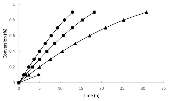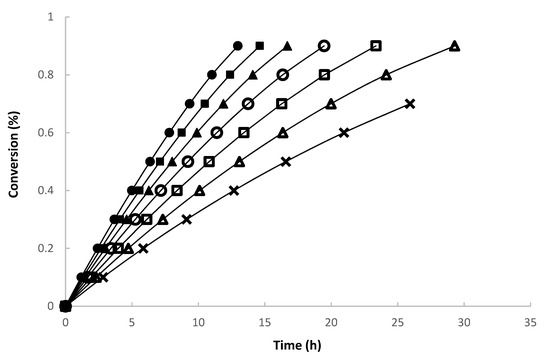 Figure 3 depicts the behavior of the conversion versus the time for the different batches without considering reactivation. It shows the gradual loss of enzymatic activity, as it takes more time to reach 90% conversion. In the case of Figure 3, for kd = 0.022 (h−1), the biocatalyst allows the operation of three batches, taking a total time of 66.8 h.