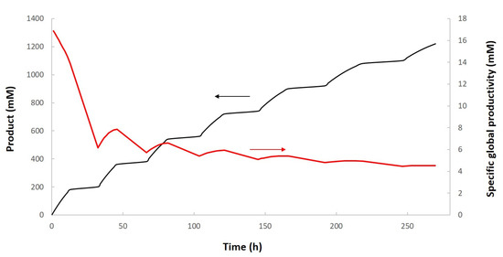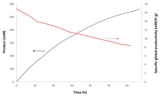 Product and specific global productivity over time during the operation of the successive batch enzyme reactor with monophasic first-order inactivation kinetics, kd = 0.022 h. Black line—Product (mM); Red line—specific global productivity (mM/h·gbiocat).