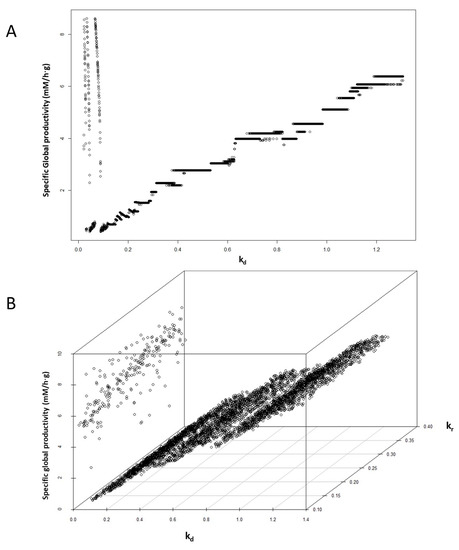 For each combination of parameters, the case was generated without reactivation and with reactivation. The analysis was developed using the stats, ggplot2 and Rmisc libraries from the R software [29] and the specific global productivity was calculated as a function of kd and kr. For the case without reactivation, the kr parameter was not used. The overall specific productivity (total product per total process time) increased as a function of kd. For the value kd = 0.03, the maximum was obtained with two batches, and the quantity of product was 360 mM (Figure 9A). We believe that this is the product of routine numerical approximation problems to solve the nonlinear equation. In the case of reactivation, specific global productivity increased with kd and kr (Figure 9B). The maximum specific global productivity with reactivation occurred with one batch.
