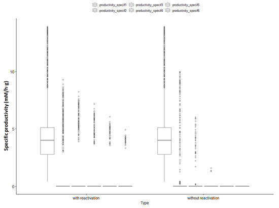 The average value of specific global productivity with reactivation was 3.79 mM/h·g, while without reactivation it was 3.68 mM/h·g. An ANOVA test revealed this difference to be significant (p = 0.002).