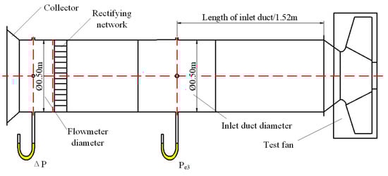 To verify the feasibility of the established three-dimensional model of a centrifugal fan in numerical simulation, the external characteristics experiment of the fan model was carried out. The fan test was conducted according to the GB / T1236–2000 standard, the air intake test system was adopted, and the test device was type C (pipe inlet and free outlet) specified by the national standard. The schematic diagram of the experimental device is shown in Figure 4.