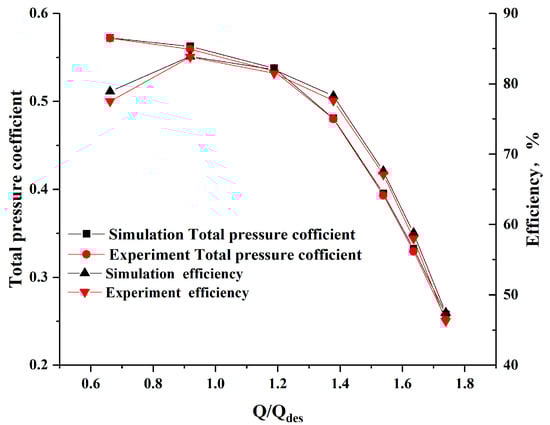 From Figure 6, the experiment results are close to the numerical results. Q/Qdes is the ratio of the experimental flow rate to the design flow rate. As the numerical simulation simplifies the model and neglects the loss, the simulation value was higher than the experimental value. The error between the tested and calculated total pressure was the smallest near the work point but gradually increased with the flow away from the design point, and the maximum deviation value did not exceed 8%.