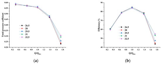 From Figure 7, the total pressure of the fan decreased with the increase of the flow rate. The efficiency of the fan increased first and then decreased, and it reached the highest value near the rated operating point. At Q/Qdes < 1.4, the total pressure of the fan increased first and then decreased with the rise of the blade outlet angle at the same flow rate. When β2 = 29.5°, the total pressure was the highest. In addition, the change trend of efficiency was different from the total pressure change. The outlet angle of the blade with the highest efficiency was different under different flow rates. At a high flow rate, the efficiency increased with the increase of the outlet angle. At the design or a low flow rate, the efficiency was the highest when the blade outlet angle was 26.5° and reached the maximum of 84.85% at the designed flow rate.