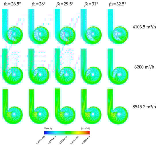 To further describe the internal flow of the fan, the relative velocity distributions in the middle section of the flow passage were obtained, as shown in Figure 8. There were vortices of different degrees in the impeller channel between 90° and 270° (see Figure 3) at different flow rates, and the number of vortices gradually decreased with the increase of the flow rate. At a low flow rate, the outlet angle had little effect on the relative velocity distribution; however, the velocity near the volute tongue increased significantly with the increase of the outlet angle.