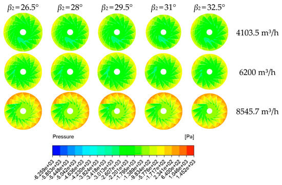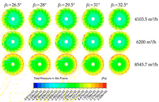 As can be seen from Figure 10, the total pressure distribution of the fan gradually increased from the impeller inlet to the outlet. As the flow rate increased, the total pressure increased. Under different outlet angles, the pressure changes in the impeller passage mainly occurred between 90° and 270°. At a low flow rate, the total pressure did not change greatly with the increase of the blade outlet angle. At the design flow rate, the low-pressure region appeared at the outlet of the single impeller, which increased first and then decreased with the increase of the outlet angle.
