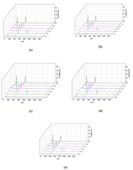 Frequency domain of the pressure pulsation for different blade outlet angles: (a) 26.5°; (b) 28°; (c) 29.5°; (d) 31°; and (e) 32.5°.