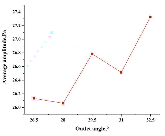 Figure 13 shows the average pressure amplitude at different outlet angles. In general, with the increase of the blade outlet angle, the pressure fluctuation amplitude of the fan increased. However, the amplitude of pressure fluctuation decreased with the increase of the blade outlet angle at 26.5°−28° and 29.5°−31°. Therefore, overall, the outlet angle of the blade increasing in a certain range reduced the pressure pulsation on the impeller, which is beneficial to reduce the noise of the impeller.