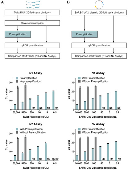 Preamplification leads to a lower limit of detection (LoD) in the microfluidic RT-qPCR method. Workflow for 10-fold serially diluted SARS-CoV-2 positive controls, with and without preamplification: (A) synthetic RNAs (Twist RNA) and (B) SARS-CoV-2 plasmid. Barplots show the Cq values with and without the preamplification step for both the N1 and N2 assays at each concentration. Data show the mean ± SD of valid Cq values from 18 replicates (2 biological replicates at each concentration, each with 9 technical replicates; each dot represents a technical replicate with a detected Cq value).