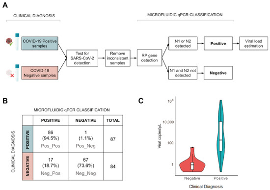 Crucially, we demonstrate the power of this method to reduce the false-negative rate of SARS-CoV-2 clinical diagnostic tests: we detected SARS-CoV-2 in 17 samples diagnosed as negative by an accredited diagnostic lab with high confidence, based on a large number of technical replicates (9 for N1, 9 for N2, 6 for RP) and a conservative threshold for Cq value consistency among sample replicates (SEM < 0.5). This is especially important considering that the viral loads of these Neg_Pos samples (0.2–40.25 viral copies/µL) were close to the LoD of standard SARS-CoV-2 tests and are thus, more likely to return false-negative results using standard RT-PCR methods. This three-step microfluidics RT-qPCR method, which includes a preamplification step, nano-scale reactions, and a large number of replicates, can reliably detect samples with low viral load and reduce the false-negative rate compared to standard RT-PCR assays.