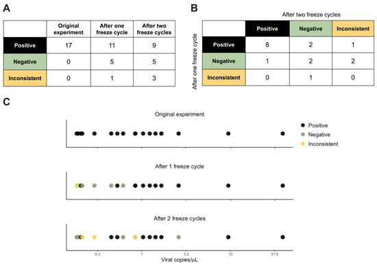 Reproducibility of results among the 17 Neg_Pos samples. (A) Summary of the microfluidic qPCR results across the original experiment and two replication experiments (after one freeze cycle and after two freeze cycles). (B) Cross-tabulation of microfluidic qPCR results in the two replication experiments. (C) Viral load estimates for the 17 Neg_Pos samples based on the original experiment. Color coding is based on the microfluidic qPCR results of the 17 samples in the two replication experiments, as either positive (black), negative (green), or inconsistent (yellow).