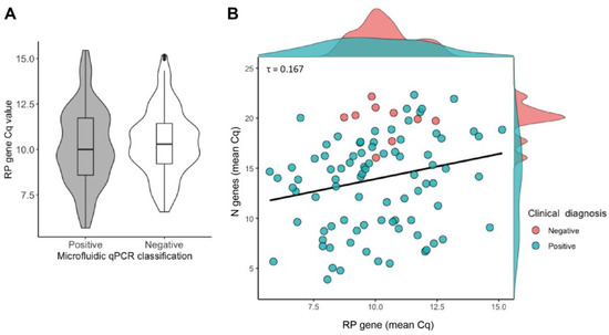 Low estimated viral titers are not due to poor quality samples. (A) Violin plots of RP gene Cq values across samples with positive and negative microfluidic qPCR results. There is no significant difference between the two groups (Welch’s t-test, p-value = 0.08). (B) Scatter and density plots of N gene vs. RP gene Cq values from microfluidic qPCR for samples with negative or positive clinical diagnostic results. Cq values for viral N and host RP genes are not strongly correlated overall (τ = 0.167, p-value = 0.017).