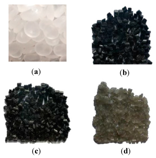 The composites were prepared via extrusion. The GF and CPW were first ground using the FRITSCH Cross Beater Mill PULVERISETTE 16 and the 0.75 mm cast iron grinding insert. The ground GF was ~10 μm while the ground CPW was ~5 μm. Different variations of GF and CPW were then mixed with PP using the 27 mm-diameter screw of a Leistritz Advanced Technologies Corporation MICRO 27 GL-32D extruder machine to form two reinforced composites (GF-PP and CPW-PP), one composite (PP), and one hybrid composite (GF-CPW-PP). The composites were extruded in a length to diameter (L/D) ratio of 32D at 180 °C and pressure of 66.9 bar. The twin-screw extruder speed was 10 rpm and the flow rate was 1.7 g/min. The four specimens were labelled (1) PP and contained 100 wt% polypropylene, (2) GF-CPW-PP and contained 5 wt% glass fibre and 5 wt% carbon prepreg waste, (3) CPW-PP and contained 10 wt% carbon prepreg waste, and (4) GF-PP and contained 10 wt% of glass fibre, as shown in Figure 1.