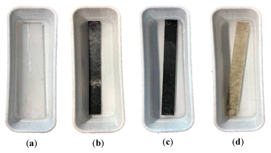 Since the appearance of a specimen’s surface is likely to affect its application, the goal was to innovate various aspects of it with or without changing its condition. For any given material, water immersion affects its characteristics based to the material’s content, structural arrangement of its individual elements, fabrication method, etc. [15,16,17,18,19,20]. A visual assessment showed that specimens immersed in distilled water varied in colour (Figure 2). PP was white while GF was grey and CPW was black. However, the GF-CPW-PP specimen initially appeared charcoal but eventually turned black as the carbon emerged allowing less light to be reflected giving it a close to zero albedo in the perceivable spectrum region. Specimen discoloration after prolonged exposure was observed. The composites changed from their original colour to a faded colour due to modifications in the matrix. As reported, the colours change in reaction to the functional group adhering to the carbon polymer chain [21]. Furthermore, morphological changes in specimen surfaces were observed post-immersion as well. While the PP specimen was slightly smooth and did not differ greatly to its surface morphology prior to immersion, the reinforced composite specimens had rougher surfaces due to fractional debonding as seen in the CPW-PP and GF-PP specimens.
