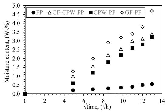 The moisture content of the PP and other composites (GF-CPW-PP, CPW-PP, and GF-PP) immersed in distilled water for 168 h are shown in Figure 3. While similar trends emerged, the difference in values may be due to dissimilarities in the specimens’ percentage of moisture as a function of square root time. The moisture content percentage value was found to increase with immersion time. This trend increased sharply indicating accelerated moisture penetration due to active moisture penetrability and capillary action. GF-PP had the highest moisture content percentage (4.7%) followed by GF-CPW-PP (3.4%), CPW-PP (3.2%), and finally PP (0.5%). The covalent bonds between the GF-PP specimen’s walls enabled more water molecules to be absorbed. Therefore, the addition of GF in GF-CPW-PP weakened interfacial forces and increased the surface tension.