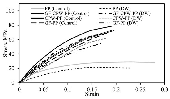 As previously mentioned, increased moisture in the specimens led to degradation and impacted mechanical performance. Water ingress influenced crack propagation and accelerated the failure mechanisms weakening the performance of, otherwise, well-built structures. Figure 6 shows the stress-strain curves of immersed specimens vs. control specimens (not immersed) in the tensile strength test. The tensile strength all the composites decreased after 168 h of immersion in distilled water. Table 3 clearly shows the difference between the specimens, where GF-CPW-PP had the highest tensile strength (78.5 ± 2.3 MPa) followed by CPW-PP and GF-PP with 73.2 ± 5.8 MPa and 69.5 ± 2.1 MPa, respectively. Therefore, the tensile strength of immersed composites decreased as a consequence of moisture absorption.