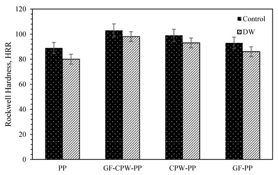 Hardness measurement, in general, depends on the selected application and deliberated material. Although common quantification methods are used, minor dissimilarity; such as stiffness variability; occur during measurement. The hardness values, according to the Rockwell (HRR) scale, based on the structural indentation of the specimens is shown in Figure 7. Prior to immersion, GF-CPW-PP had the highest HRR value (103) followed by PCW-PP, GF-PP, and PP with 99, 93, and 89, respectively. Post-168 h of immersion, the hardness test was performed again. The immersed specimens showed a decreasing trend in hardness. GF-CPW-PP, once again, had the highest HRR value (98) followed by CPW-PP, GF-PP, and PP with 93, 86, and 80, respectively.