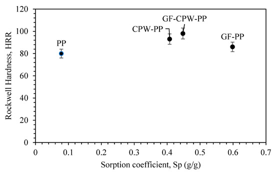 The change in hardness were a function of moisture absorption. The correlation between hardness and sorption coefficient is shown in Figure 8. This may have caused the densification of the specimens and possibly the pores within the interfacial bond between fibres and matrix as depicted by the SEM micrograph. Despite the addition of fibre reinforcement, composites demonstrated decrease in hardness as expected by the transformation of the sheared GF and/or CPW to deform the fibres around the PP. This caused a large non-agglomeration from decomposition of the integrated fibres [28,29] leading to increased internal porosity and further decrease in hardness. Other than that, the incorporation of 10% fibre reinforcement led to minor differences in hardness value. Therefore, although the addition of fibre reinforcement increased the rigidity of the composites, it caused porosity and a less integrate fibre structure that decreased hardness.