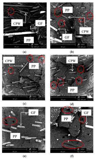 SEM images of (a) GF-CPW-PP (control); (b) GF-CPW-PP (DW); (c) CPW-PP (control); (d) CPW-PP (DW); (e) GF-PP (control), and (f) GF-PP (DW) specimens. (red circle shows porosity).