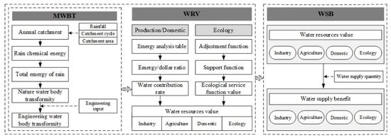 Emergy is a new concept in the ecological economics that measures the products and processes of natural systems and economic systems. Using the direct and indirect cost of solar energy to evaluate any energy or material, emergy analysis is the new development of energy analysis not only in concept but also on calculation method. Based on the emergy analysis theory, the evaluation model of reservoir production, domestic and ecological water supply benefits were constructed, including three parts: multisource water body transformity, WRV and water supply benefit. Module 1 calculates the transformity of different water body. On this basis, the transformity of the water supply city’s surface, underground natural and engineering water bodies are calculated. The results provide support for the WRV accounting modules of various industries in the water supply city. In Module 2, emergy systems of various industries are established by emergy analysis theory, the input–output relationship of each system is analyzed, the value of production and domestic water resources is calculated. Based on ecosystem services, a completer and more comprehensive index system is proposed to express the functions of ecological services. By quantifying these indexes, the value of ecological water resources is calculated. Through Module 2, the benefits brought by each cubic meter of water in various industries was obtained, and the economic development level of each industry and ecological environment was understood. Based on this, Module 3 combines the water supply volume of the reservoir in various industries in the water supply city and the downstream flow of the reservoir to obtain the ecology and economics benefits and total benefits of the reservoir. Through this module, the benefits of industrial, agricultural and domestic water supply of the reservoir can be obtained as well as the ecological benefits brought by the reservoir to the downstream. The water supply benefits of the reservoir are comprehensively discussed, so as to provide references for alleviating the contradiction of water use in various industries and rationally allocating water resources. The model structure is shown in Figure 1.