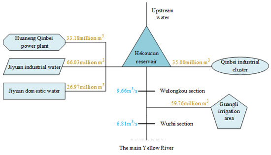 The research object of this paper is Hekoucun reservoir and the corresponding water supply city. The Hekoucun reservoir, located at the outlet of the last section of the Qinhe River, a tributary of the Yellow River in China, about 9 km below the Wulongkou Hydrological Station, is an important part of the flood control engineering system in the lower Yellow River. The control basin area of Hekoucun reservoir is 9223 km2, and the annual average reservoir runoff is 492 million m3, with a total storage capacity of 317 million m3. The water supply scope of the reservoir involves Jiyuan City and Jiaozuo City in Henan Province, among them, Jiyuan City includes Jiyuan City Domestic and Industry, Huaneng Qinbei Power Plant, and Jiaozuo City includes Qinbei Industry Cluster and Guangli Irrigation District. In addition, the ecological flow of the Wulongkou and Wuzhi section downstream of the reservoir should be taken into account. The Qinhe River Basin and the water supply city are shown in Figure 2. The location distribution of each water user is shown in Figure 3. According to the hydrological regime for many years, the basic ecological flow of Wulongkou and Wuzhi sections is estimated by Tennant method to be 5.44 m3/s and 3.84 m3/s. Based on the current water demand, the government reasonably plans to evaluate the water demand of various industries in 2030, as shown in Table 1. Under the condition that the basic ecological flow of the downstream reaches of the reservoir is up to the standard, the water demand of various industries should be met as much as possible, and the benefit of ecological and economic water supply for the Hekoucun reservoir planning is calculated.