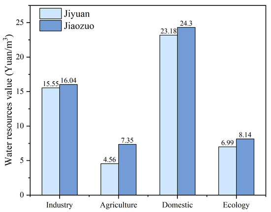 Whether in Jiyuan or in Jiaozuo, there are obvious differences in the water resources value of various industries by analyzing the calculation results of water resources value. The trend of water resources value is domestic > industry > ecology > agriculture, as shown in Figure 4, which is consistent with the law of WRV in most parts of the world.