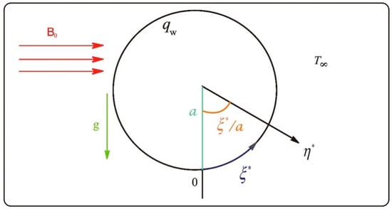 The significance of convection from a cylindrical geometry lies in the fact that they are used in numerous physical and engineering applications; these wide usages made researchers direct their great efforts towards this problem. Blasius and Frossling [,] solved the momentum and energy equations of combined convection from a horizontal cylinder, respectively. Merkin [,] obtained the exact solution for free and combined convection past a horizontal cylinder. Since then, this topic has been extended to include many cases in Newtonian or non-Newtonian fluids, in mixed, forced, or free convection, and many other cases. Merkin and Pop [] addressed the free convection of viscous fluid about a circular cylinder with prescribed heat flux. Nazar et al. [] investigated the combined convection flow of micropolar fluid around a circular cylinder. Anwar et al. [] illustrated the combined convection from a cylinder in a viscoelastic fluid. Mabood et al. [] analyzed the forced convection flow of nanofluid about a cylinder taken into account convective boundary condition. Roa et al. [] examined Magnetohydrodynamic (MHD) free convection flow of Williamson non-Newtonian fluid around a circular cylinder considering Newtonian heating. However, it is well known that the rate of heat transfer may be enhanced depending on the geometry and operating conditions. For more reading, see the following references [,,,,,,,].