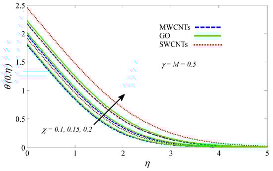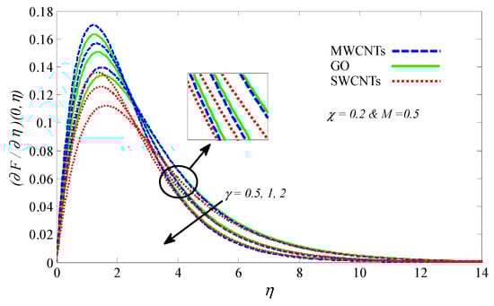 Figure 2 and Figure 3 reveal the impact of nanoparticle volume fraction on temperature and velocity, respectively. It is found from these figures that a rise in leads to enhance the temperature and velocity; this occurs because an increment improves the convection from the cylinder to methanol and the energy transmission, therefore increases the temperature and velocity. This can be demonstrated when the thermal conductivity of nanofluids increases as the solid nanoparticles enlarge which are having a great thermal conductivity than the base fluid. Hence, the heat transfer from the base fluid to solid nanoparticles is greater and magnifies the temperature of the nanofluid. Further, it is depicted that the nanofluid temperature increases sufficiently with increasing values of for SWCNTs as well as for GO than in the case of MWCNTs. Substantially, this is due to the cause that a rise in indications to a growth in the thermal conductivity of SWCNTs/Go nanofluid, and hereafter the viscosity of the thermal boundary layer elevates.
