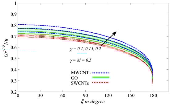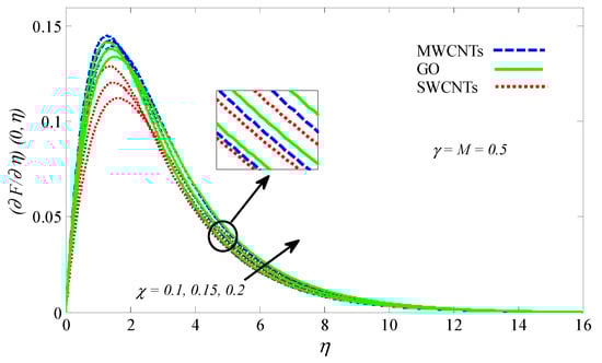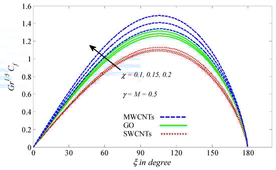 Figure 4 and Figure 5 illustrate that the nanoparticle volume fraction is directly proportional to both local skin friction coefficient and local Nusselt number. Augmentation in the value of improves thermal conductivity and density of methanol, thereby enhancing and . This is due to the fact that, with increasing the values of nanoparticle volume fraction parameter, both the momentum and thermal boundary layer thickness grows as mentioned in Figure 4 and Figure 5. This means the skin friction and the heat transfer rate intensifies in the nanofluids area when the volume fraction of nanoparticle augments.