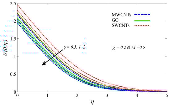 Figure 6 and Figure 7 evidence that with rising the Casson parameter , the temperature and velocity decrease. Actually, growing values of generate resistance forces that act to inhibit the fluid’s velocity. Physically, a greater and smaller value of corresponds to Newtonian and non-Newtonian fluids, respectively (i.e., decreases the yield stress). However, it agrees with the stated physical analogy, which is due to the temperature injected that influences the nanofluid temperature.